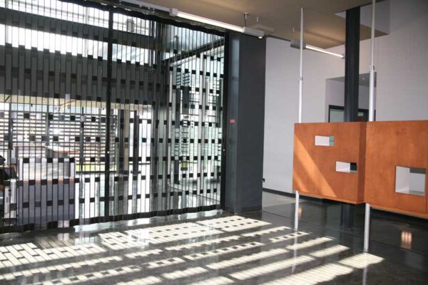 • Stacks compactly to one side when open — full passage width clear during operating hours