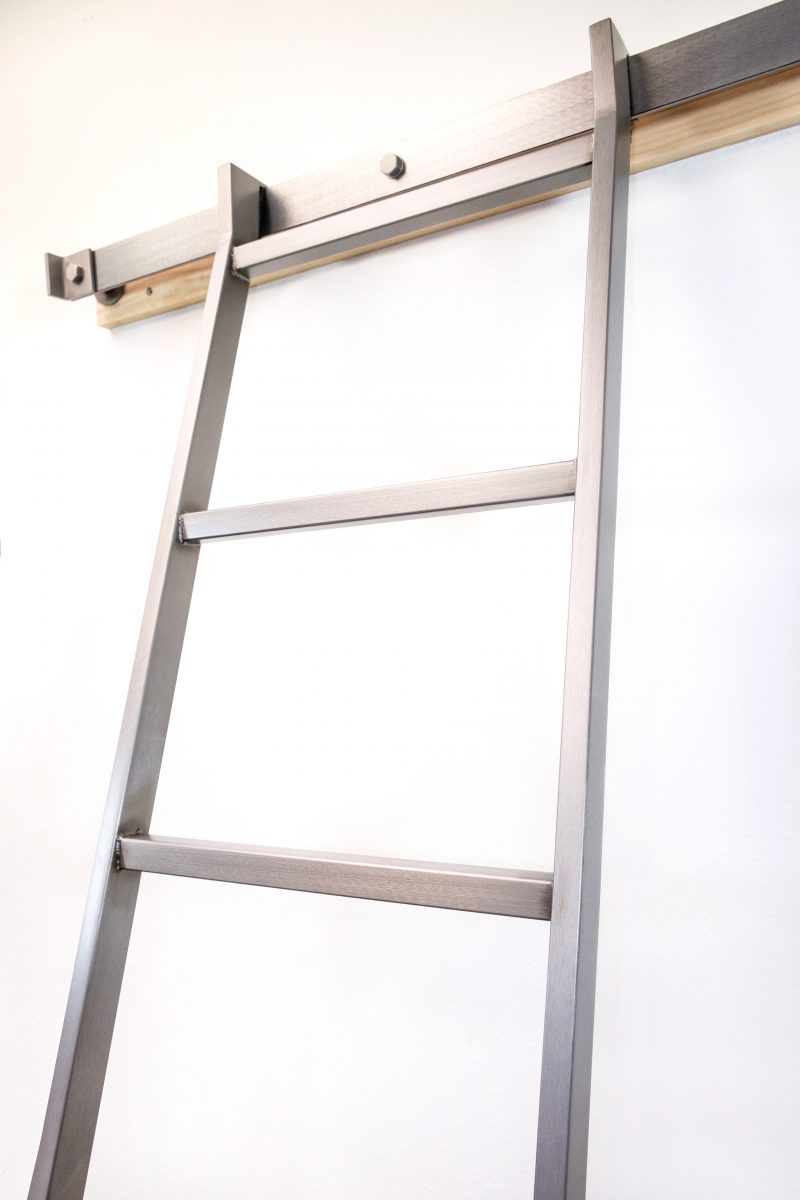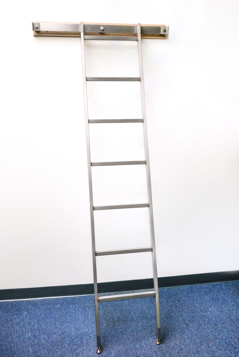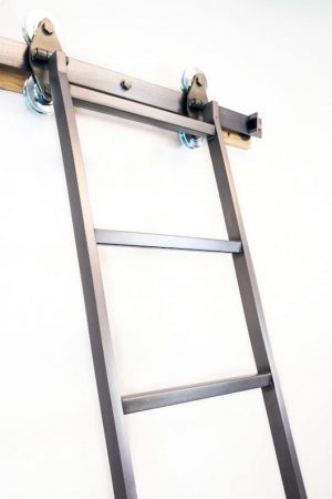 The Skyhook Ladder series uses our industrial flat track rail system with a hook design. This system is commonly used when more than one location for the same ladder is desired. The flat track rail is 2” x 1⁄4” carbon steel available in any of our standard finishes. Adjustable leveling feet are standard on all models.