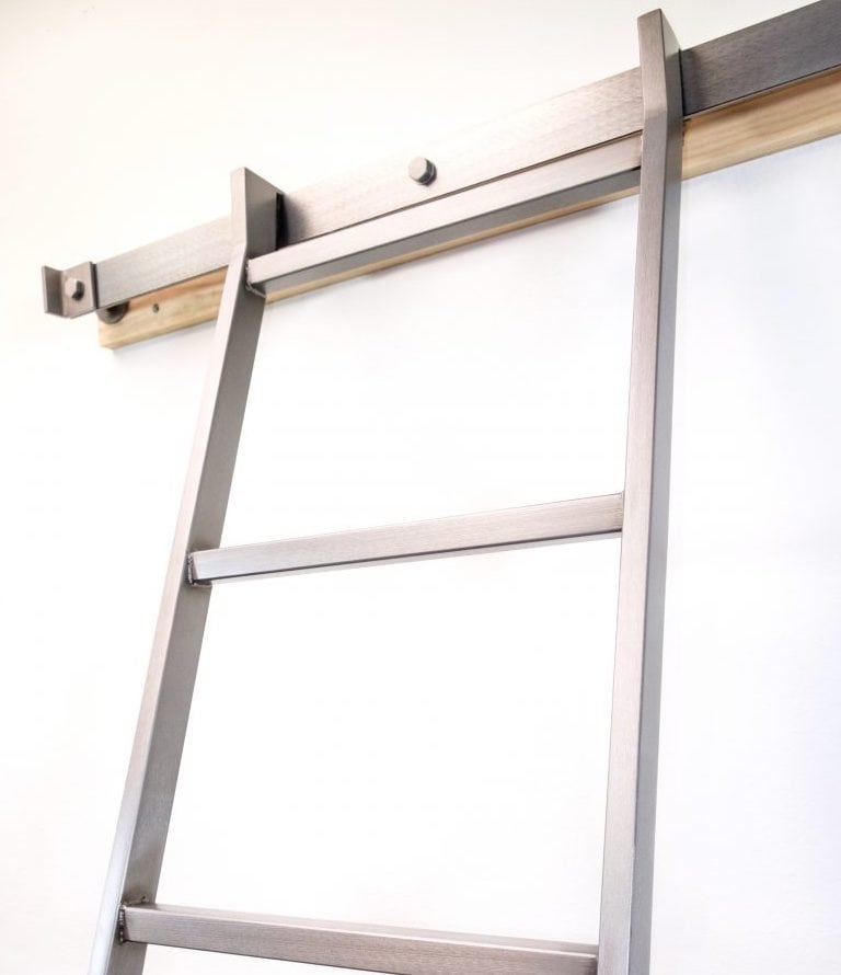 This design allows the user to remove the ladder without tools and relocate it to a different location on a separate track system.